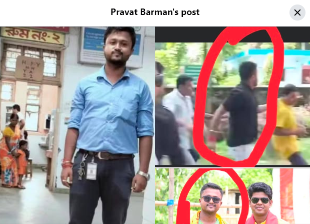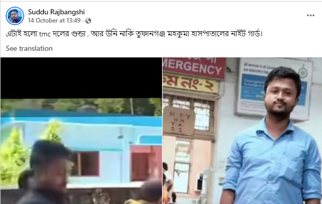 অনুসন্ধানৰ আৰম্ভণীতে আমি ভিডিঅ’টোৰ কী-ফ্ৰেমৰ ৰিভাৰ্ছ ইমেজ ছাৰ্চ কৰি চালোঁ। তেতিয়া আমি যোৱা ১৪ অক্টোবৰ ২০২৫ত ফেচবুকত এগৰাকী ব্যৱহাৰকাৰীয়ে দিয়া এটা পোষ্ট পালোঁ। তাত বাংলা ভাষাত লিখা আছিল এইদৰে- এটাই হলো tmc দলের গুন্ডা , আর উনি নাকি তুফানগঞ্জ মহকুমা হাসপাতালের নাইট গার্ড। (এইজনেই হৈছে টিএমচি দলৰ গুণ্ডা, আৰু ইয়েই তুফানগঞ্জ মহকুমাৰ হাস্পাতালৰ নাইট গাৰ্ড) সেই পোষ্টটোত দুখন ফটো আছিল। তাৰে এখন এজন যুৱকৰ আৰু আনখন এটা স্ক্ৰীণশ্বট।