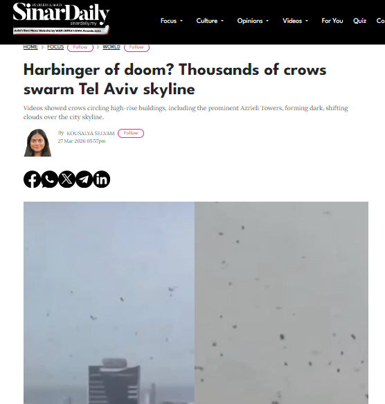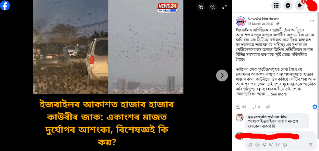 শেহতীয়াকৈ অসমৰ এটা ফেচবুক পেজত দুখন ফটো একেলগে আপলোড কৰি সেয়া ইজৰাইলৰ আকাশত অসংখ্য কাউৰীৰ বিচৰণৰ দৃশ্য বুলি দাবী কৰিছে। দৃশ্যটোত লিখিছে–  ইজৰাইলৰ বাণিজ্যিক ৰাজধানী টেল আভিভৰ আকাশত হাজাৰ হাজাৰ কাউৰীৰ অস্বাভাৱিক জাকে চানি ধৰা এক ভিডিঅ’ বৰ্তমান সামাজিক মাধ্যমত ব্যাপকভাৱে ভাইৰেল হৈ পৰিছে। এই দৃশ্যক লৈ নেটিজেনসকলৰ মাজত মিশ্ৰিত প্ৰতিক্ৰিয়াৰ লগতে বিভিন্ন ৰহস্যময় ধাৰণাৰো সৃষ্টি হোৱা পৰিলক্ষিত হৈছে।