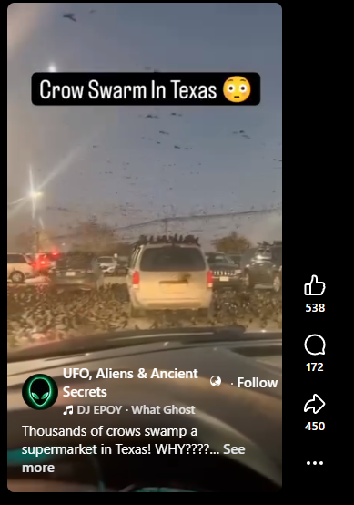 আমাৰ সন্ধান আগুৱাই নিয়াত আমি একেটা ভিডিঅ’ ২০২৪ৰ এপ্ৰিলত ফেচবুকত আপলোড কৰি থোৱা দেখিলোঁ। তাত লিখা আছিল- Thousands of crows swamp a supermarket in Texas! WHY???? WTF is going on here?