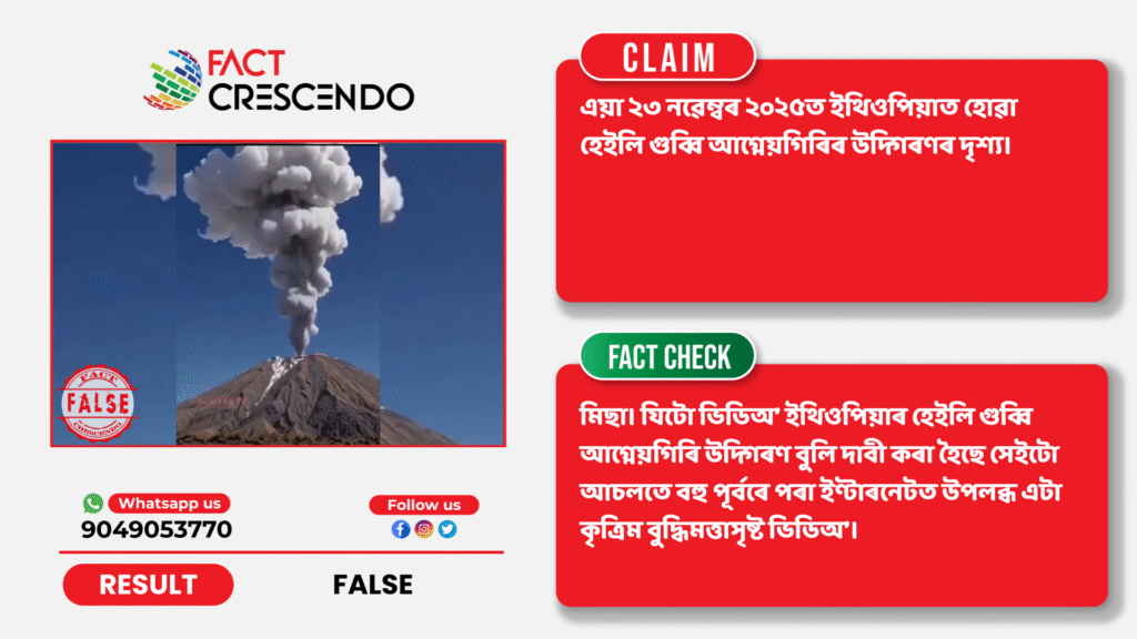 ফেক্ট ক্ৰেছেণ্ডো অসমীয়াৰ অনুসন্ধানত এই কথা নিশ্চিত হৈছে যে দাবীটো মিছা। যিটো ভিডিঅ’ ইথিওপিয়াৰ হেইলি গুব্বি আগ্নেয়গিৰি উদ্গিৰণ বুলি দাবী কৰা হৈছে সেইটো আচলতে বহু পূৰ্বৰে পৰা ইণ্টাৰনেটত উপলব্ধ এটা কৃত্ৰিম বুদ্ধিমত্তাসৃষ্ট ভিডিঅ’।