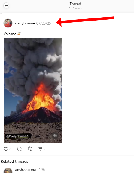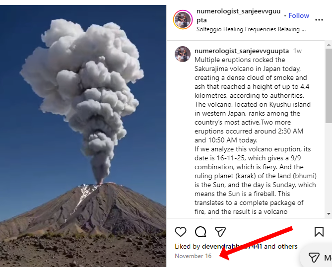 তেতিয়া আমি সেই দৃশ্য বিভিন্ন সময়ত সামাজিক মাধ্যমত ভিন্নস্থানৰ উদ্গিৰণ বুলি উল্লেখ কৰি আপলোড কৰি থোৱা দেখিলোঁ। যোৱা ২৩ নৱেম্বৰ ২০২৫ত ইথিওপিয়াৰ হেইলি গুব্বি আগ্নেয়গিৰিৰ উদ্গিৰণৰ ১১টা দিন পূৰ্বে অৰ্থাৎ ১৬ নৱেম্বৰ ২০২৫ত ইনষ্টাগ্ৰামত সেই দৃশ্য জাপানৰ চুকুৰাজিমা আগ্নেয়গিৰিৰ উদ্গিৰণৰ দৃশ্য বুলি উল্লেখ কৰি আপলোড কৰি থোৱা আমি দেখিলোঁ। এই তথ্যই দৃশ্যটো পুৰণি বুলি প্ৰমাণ কৰিলে।