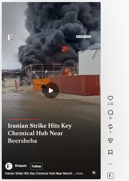 ইয়াৰ পৰাই প্ৰমাণ হয় যে যিটো দৃশ্যাংশ ইজৰইলৰ হাইফাত থকা ৰিফাইনেৰীত ইৰাণ শেহতীয়া আক্ৰমণ বুলি প্ৰচাৰ কৰা হৈছে, সেইটো আচলতে বীৰচিবাৰ সমীপত নিওত হোভাভৰ ৰাসায়নিক ঔদ্যোগিক অঞ্চলৰ এক পুৰণি হে দৃশ্য।