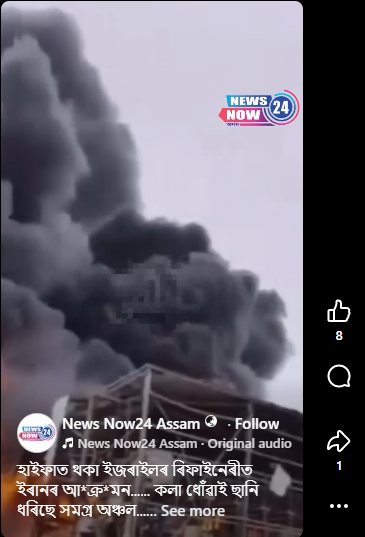 শেহতীয়াকৈ অসমৰ এটা ফেচবুক পেজত এটা ভিডিঅ’ আপলোড কৰি সেয়া ইজৰাইলৰ হাইফাত থকা ৰিফাইনেৰীত শেহতীয়াকৈ ইৰাণে আক্ৰমণ কৰা দৃশ্য বুলি দাবী কৰিছে। দৃশ্যটোত লিখিছে– হাইফাত থকা ইজৰাইলৰ ৰিফাইনেৰীত ইৰানৰ আ*ক্ৰ*মন…… কলা ধোঁৱাই ছানি ধৰিছে সমগ্ৰ অঞ্চল