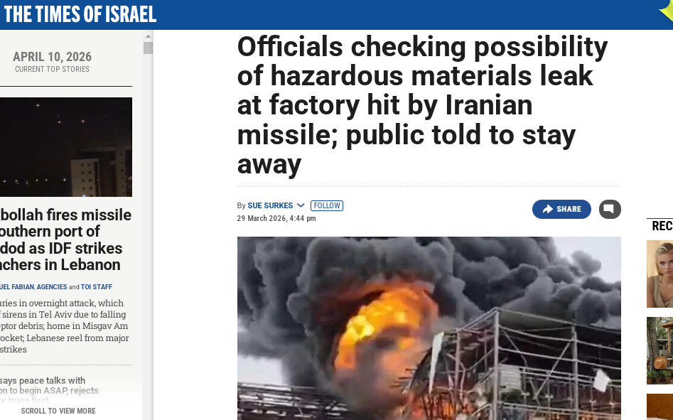টাইমছ অৱ ইজৰাইলৰ ২৯ মাৰ্চ ২০২৬ৰ Officials checking possibility of hazardous materials leak at factory hit by Iranian missile; public told to stay away শীৰ্ষক বাতৰিতো আমি সেই দৃশ্যটোৰ স্ক্ৰীণশ্বট দেখিলোঁ।