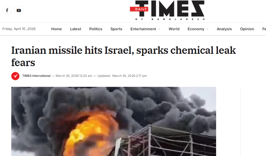 ৩০ মাৰ্চ ২০২৬ত প্ৰকাশিত ডেইলী টাইমৰ Iranian missile hits Israel, sparks chemical leak fears শীৰ্ষক বাতৰিত দৃশ্যটোৰ খণ্ডচিত্ৰ আমি দেখিলোঁ। বাতৰিটোৰ আৰম্ভনী স্তৱকতে লিখা হৈছে- An Iranian missile strike targeted the Neot Hovav industrial zone near Beersheba, Israel on Thursday, resulting in a fire and a suspected hazardous materials leak at a factory.