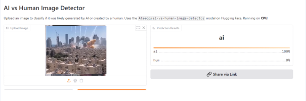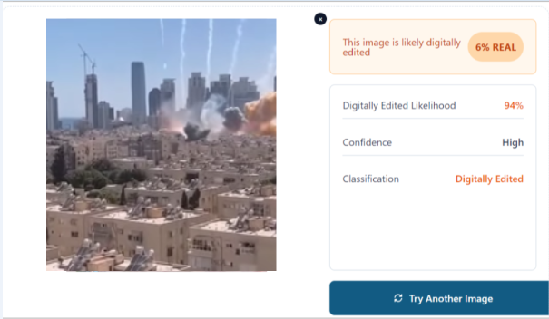 প্ৰথম ক্লিপটো গেমৰ দৃশ্য বুলি নিশ্চিত হোৱাৰ পাছত আমি দ্বিতীয় ক্লিপটোৰ কী-ফ্ৰেমৰ ৰিভাৰ্ছ ইমেজ ছাৰ্চ কৰিলোঁ। তেতিয়া আমি সেই ক্লিপটো কোনো নিৰ্ভৰযোগ্য তথা প্ৰতিষ্ঠিত সংবাদ প্ৰতিষ্ঠানত ইজৰাইলৰ ওপৰত চলা আক্ৰমণৰ দৃশ্য বুলি উল্লেখ কৰা নেদেখিলোঁ। এইবাৰ আমি সেই ক্লিপটো ভালকৈ পৰ্যবেক্ষণ কৰি তাত কিছুমান বিসংগতি ধৰা পেলালোঁ। আমাৰ চকুত পৰিল যে সেই স্থানত কেইবাটাও হুবহু একেই অট্টালিকা আছে আৰু আটাইকেইটাৰে ওপৰত হুবহু একেই স্থানত একে ধৰণে চোলাৰ পেনেল লগোৱা আছে। সাধাৰণতে AI Generated ভিডিঅ’ বা ফটোৰ ক্ষেত্ৰত এনেকুৱা হোৱা দেখা যায়। কাৰণ সেই দৃশ্য নিৰ্দিষ্ট প্ৰম্প্টৰ ভিত্তিত সৃষ্টি হয় আৰু কৃত্ৰিম বুদ্ধিমত্তাই সেই প্ৰম্প্ট অনুসৰণ কৰি দৃশ্য সৃষ্টি কৰে।