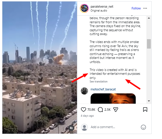 অনুসন্ধান আগুৱাই লৈ যোৱাত অৱশেষত আমি সেই দৃশ্যটো মূলতঃ য’ত আপলোড কৰা হৈছিল সেই ইনষ্টাগ্ৰাম হেণ্ডেলটো পালোঁ আৰু তাত দৃশ্যটো দেখিলোঁ। তাত স্পষ্টভাৱে উল্লেখ কৰা হৈছে যে সেইটো AI Generated আৰু তাক মনোৰঞ্জনৰ উদ্দেশ্যেৰে সৃষ্টি কৰা হৈছে।