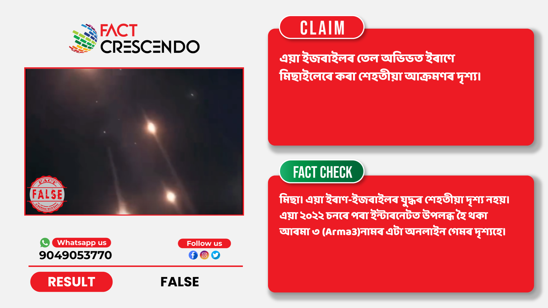 এই তথ্যসমূহৰ পৰা আমি নিশ্চিত হৈছোঁ যে অসমৰ ফেচবুক একাউণ্টটোৰ পৰা কৰা দাবীটো মিছা। এয়া ইৰাণ-ইজৰাইলৰ শেহতীয়া দৃশ্য নহয়। এয়া ২০২২ চনৰে পৰা ইন্টাৰনেটত উপলব্ধ হৈ থকা আৰমা ৩ নামৰ এটা অনলাইন গেমৰ দৃশ্যহে।