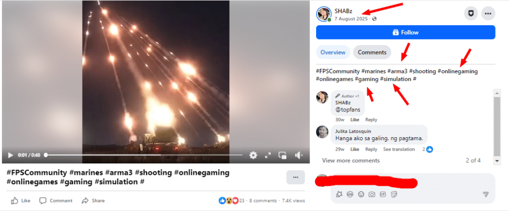 দৃশ্যটো প্ৰায় এবছৰ পুৰণি বুলি নিশ্চিত হোৱাৰ পাছত আমি আমাৰ সন্ধান আৰু অধিক আগুৱাই নিলোঁ আৰু তেতিয়া ২০২৫ৰ ৭ আগষ্টত এই দৃশ্যটো এক ফেচবুক পেজত আপলোড কৰা দেখিলোঁ। তাত আমি কেইটামান শব্দ হেশ্বটেগ হিচাপে পালোঁ। সেই শব্দকেইটা হৈছে ক্ৰমে arma3, onlinegaming, onlinegame, simulation ইত্যাদি।