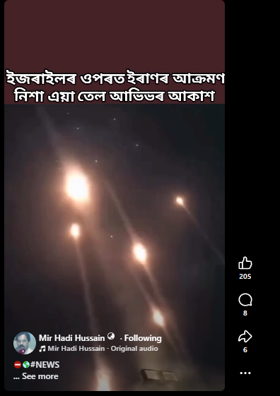 শেহতীয়াকৈ অসমৰ এগৰাকী ফেচবুক ব্যৱহাৰকাৰীয়ে এটা ভিডিঅ’ আপলোড কৰি সেয়া ইজৰাইলৰ তেল অভিভৰ ওপৰত ইৰাণৰ মিছাইল আক্ৰমণ বুলি দাবী কৰা হৈছে। লিখিছে- বৃহত ক্ষতিৰ সন্মুখীন ইজৰাইল–সেনাৰ চকুতও পানী। হতাশগ্ৰস্ত PM ন্যেত্যানুহু–ইৰাণৰ বধ লিষ্টত ন্যেত্যানুহু। প্ৰাণৰ ভয়ত ৰোগীয়া দেহাৰে বাংকাৰত আশ্ৰয়। The Cradle মেডিয়াৰ মতে ইজৰাইলৰ তেল আভিভৰ পৌৰ নিগমে প্ৰথম দুদিনত চহৰখনৰ দুশ বিল্ডিঙ ধ্বংস হৈ যোৱা আৰু শ-শ ক্ষতিগ্ৰস্ত হোৱা বুলি প্ৰকাশ কৰিছে। তেল আভিভৰ হাবনাই ষ্ট্ৰীটত অৱস্হিত বাছ ডিপোত হোৱা ইৰাণৰ মিছাইল আক্ৰমণত ২৮খন বাছ জ্বলিল।