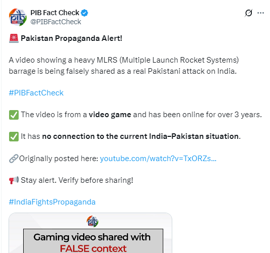 ২০২৫ মে’ মাহত এই দৃশ্যটো ভাৰত-পাকিস্তানৰ যুদ্ধৰ দৃশ্য বুলি মিছাকৈ প্ৰচাৰ হৈছিল আৰু সেই সত্যতা নিৰূপণ কৰা এটা টুইট আমি পালোঁ। পিআইবি ফেক্ট চেকে সেই সময়তেই এই সত্যতা নিৰূপণ কৰিছিল।