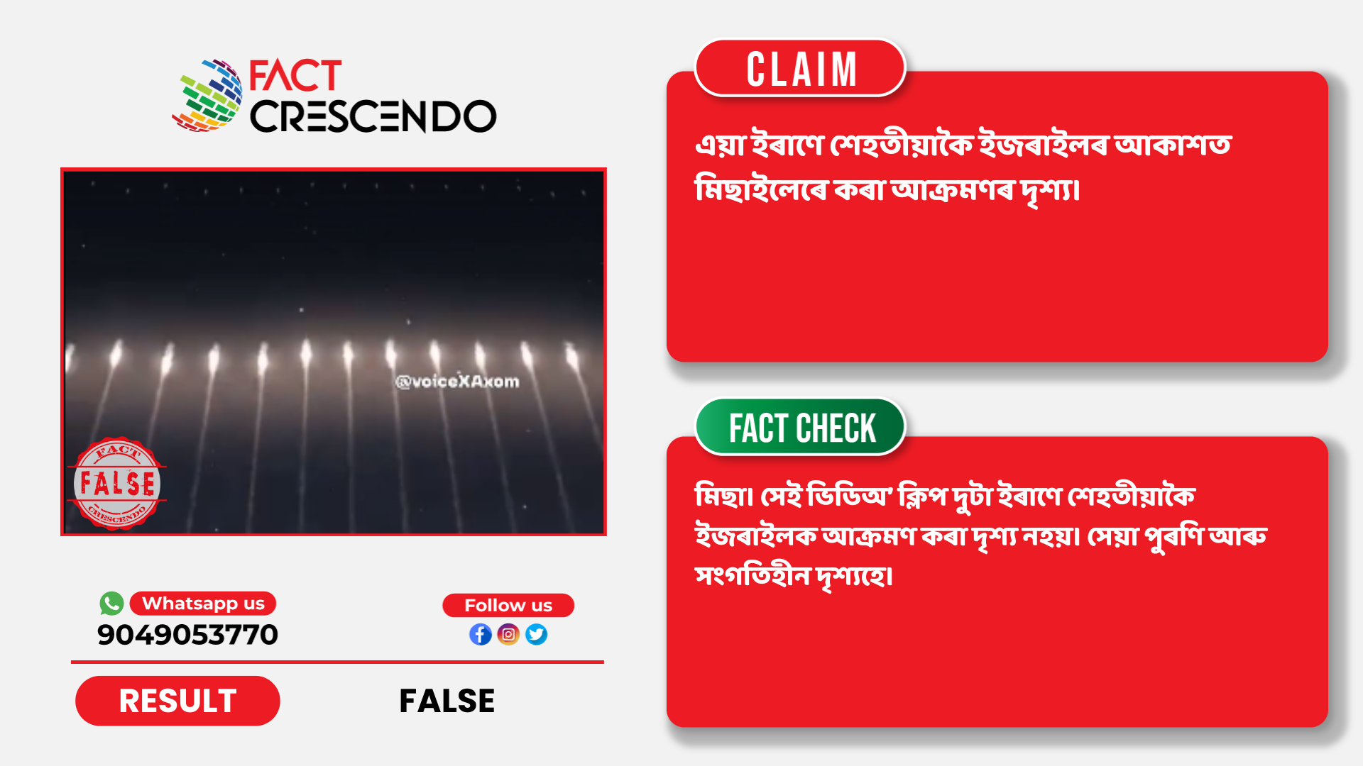 এই তথ্যসমূহৰ পৰা আমি নিশ্চিত হৈছোঁ যে অসমৰ ফেচবুক পেজটোৰ পৰা কৰা দাবীটো মিছা। সেই ভিডিঅ’ ক্লিপ দুটা ইৰাণে শেহতীয়াকৈ ইজৰাইলক আক্ৰমণ কৰা দৃশ্য নহয়। সেয়া পুৰণি আৰু সংগতিহীন দৃশ্যহে।