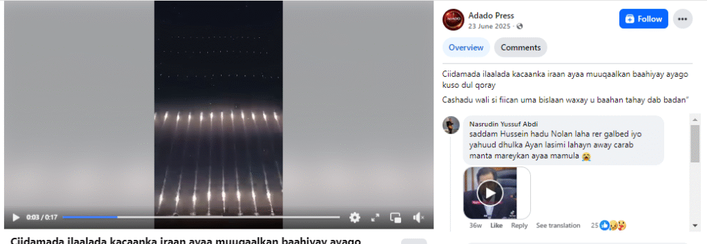 Adado Press নামৰ ফেচবুক পেজটোতো ২০২৫ৰ ২৩জুনত এই ক্লিপটো আপলোড কৰি চোমালী ভাষাত Ciidamada ilaalada kacaanka iraan ayaa muuqaalkan baahiyay ayago kuso dul qoray Cashadu wali si fiican uma bislaan waxay u baahan tahay dab badan” বুলি কেপছন লিখা হৈছে, যাৰ অসমীয়া অৰ্থ হৈছে -ইৰাণৰ ৰিভল্যুচনেৰী গাৰ্ডে ভিডিঅ’টো প্ৰকাশ কৰি লিখিছে যে, “ৰাতিৰ আহাৰ এতিয়াও সঠিকভাৱে ৰন্ধা হোৱা নাই, ইয়াক বহুত জুইৰ প্ৰয়োজন।”