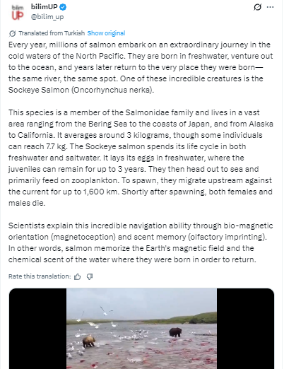 তাৰ পাছত আমি এক্সত এটা টুইট পালোঁ। তাত সেই ভিডিঅ’টো আপলোড কৰি সেই সম্পৰ্কে সবিস্তাৰে লিখা আমি দেখিলোঁ। তাত লিখা তথ্য মতে- প্ৰতি বছৰে উত্তৰ প্ৰশান্ত মহাসাগৰীয় অঞ্চলৰ ঠাণ্ডা পানীত লাখ লাখ ছালমনে এক অসাধাৰণ যাত্ৰাত নামি পৰে। সেইবোৰে মিঠা পানীত জন্ম লৈ পাছত সাগৰলৈ ওলাই যোৱাৰ সাহস কৰে আৰু বছৰ বছৰ পাছত জন্ম লোৱা ঠাইখনলৈ উভতি আহে— একেখন নদী, একেটা ঠাই। এই অবিশ্বাস্য জীৱবোৰৰ ভিতৰত এটা হ’ল ছকাই ছালমন -Sockeye Salmon (Oncorhynchus nerka)।