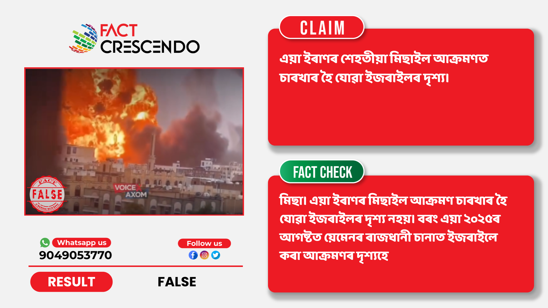 ইয়াৰ পৰাই আমি নিশ্চিত হওঁ যে যে অসমৰ ফেচবুক পেজটোৱে কৰা দাবীটো মিছা। এয়া ইৰাণৰ মিছাইল আক্ৰমণ চাৰখাৰ হৈ যোৱা ইজৰাইলৰ দৃশ্য নহয়। বৰং এয়া ২০২৫ৰ আগষ্টত য়েমেনৰ ৰাজধানী চানাত ইজৰাইলে কৰা আক্ৰমণৰ দৃশ্যহে