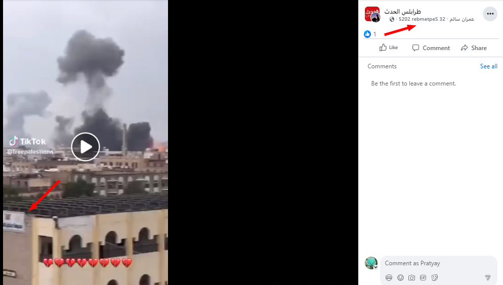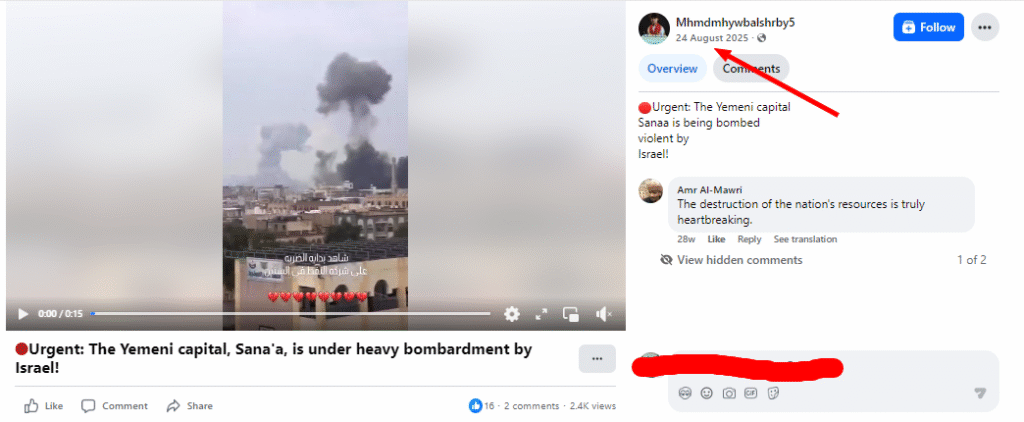 অনুসন্ধানৰ আৰম্ভণিতে আমি সেই ভিডিঅ’টোৰ কী-ফ্ৰেমৰ ৰিভাৰ্ছ ইমেজ ছাৰ্চ কৰিলোঁ। তেতিয়া আমি সেই ভিডিঅ’টো ২০২৫ৰ ২৪ আগষ্টত এটা ফেচবুক একাউণ্টত আপলোড হৈ থকা দেখিলোঁ। তাত লিখা আছিল- Urgent: The Yemeni capital, Sana’a, is under heavy bombardment by Israel! (য়েমেনৰ ৰাজধানী চানা ইজৰাইলৰ ভয়ংকৰ বোমাবৰ্ষণৰ কৱলত।)