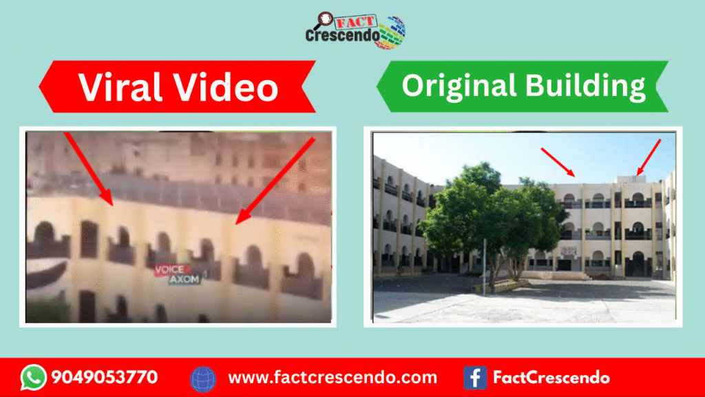 আমি এই ফেচবুক পোষ্টত পোৱা অট্টালিকাৰ ফটোখন আৰু সত্যতা নিৰূপণ কৰি থকা ভিডিঅ’টোত দেখা অট্টালিকাটোৰ তুলনা কৰি দেখিলোঁ যে সেয়া একেটাই অট্টালিকা। অৰ্থাত সেয়া য়েমেনৰ ৰাজধানী চানাত থকা আজাবান মডেল স্কুল। তলত সেই তুলনা চাব পাৰিব।