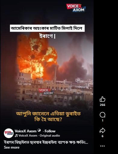 শেহতীয়াকৈ অসমৰ এটা ফেচবুক পেজত এটা ভিডিঅ’ আপলোড কৰি সেয়া ইৰাণে শেহতীয়াকৈ ইজৰাইলৰ ওপৰত মিছাইলেৰে কৰা আক্ৰমণৰ দৃশ্য বুলি দাবী কৰিছে। দৃশ্যটোত লিখিছে- ইৰাণৰ মিছাইলত ছাৰখাৰ ইজৰাইল! ব্যাপক ক্ষয়-ক্ষতি। ইৰাণৰ মিছাইলৰ ভয়ংকৰ পৰিণতি। ইজৰাইলৰ বিভিন্ন প্ৰান্তত এতিয়া কেৱল ধ্বংসৰ চিন। ইৰাণৰ এই বিধ্বংসী আক্ৰমণৰ পাছত মধ্য-প্ৰাচ্যৰ যুদ্ধই কোন দিশে গতি কৰিব?