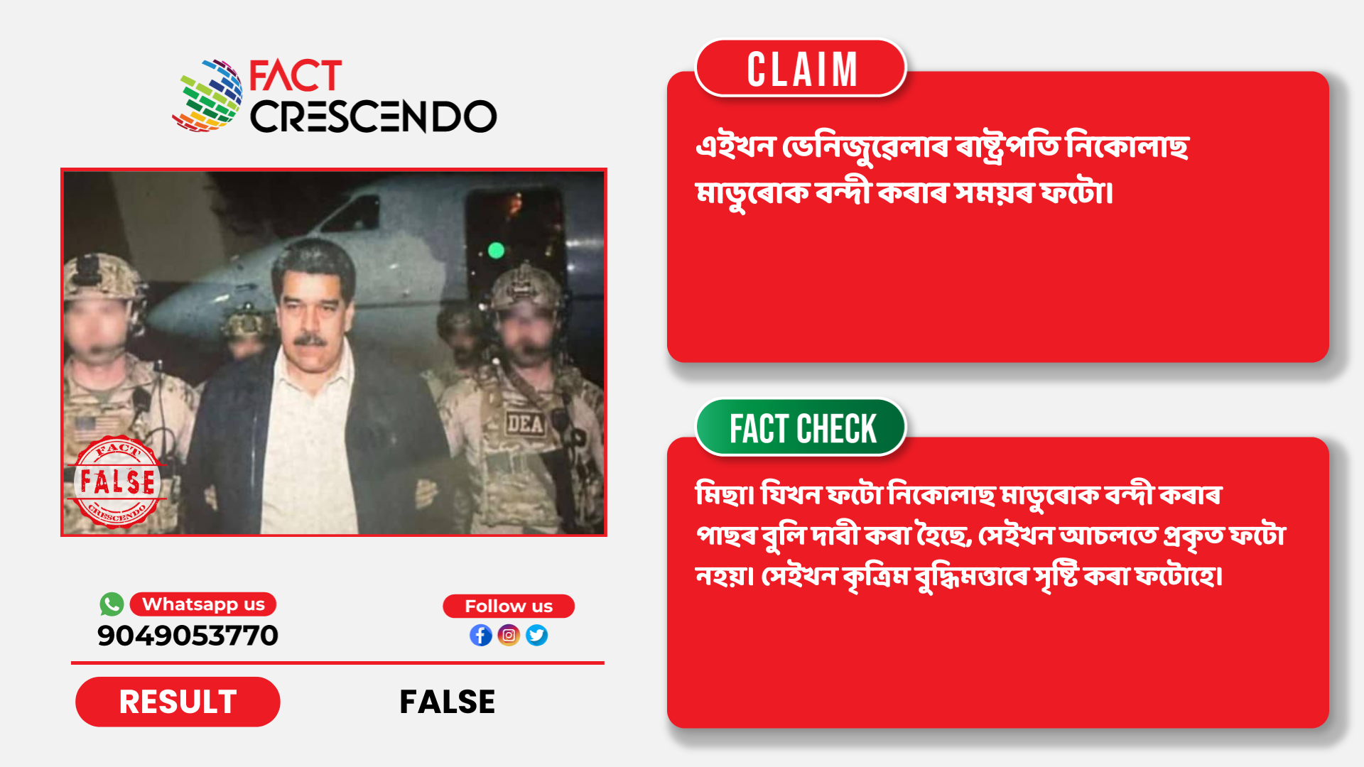 ফেক্ট ক্ৰেছেণ্ডো অসমীয়াৰ অনুসন্ধানত এই কথা নিশ্চিত হৈছে যে দাবীটো মিছা। যিখন ফটো নিকোলাছ মাডুৰোক বন্দী কৰাৰ পাছৰ বুলি দাবী কৰা হৈছে, সেইখন আচলতে প্ৰকৃত ফটো নহয়। সেইখন কৃত্ৰিম বুদ্ধিমত্তাৰে সৃষ্টি কৰা ফটোহে।