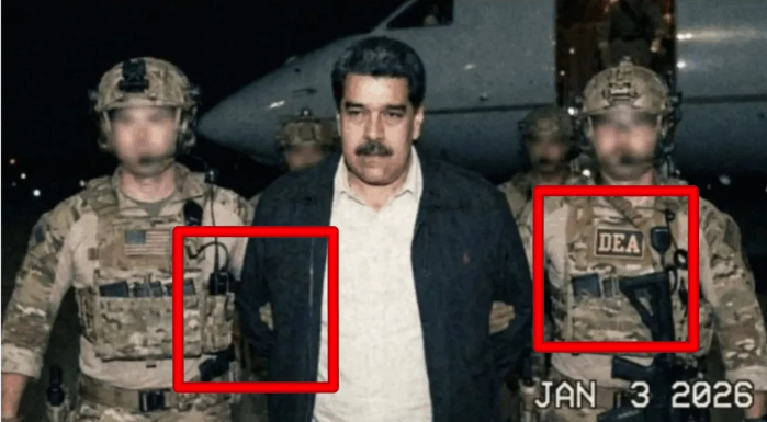তদুপৰি সেই ফটোখন ভুৱা হোৱাৰ আন এটা তথ্য হ’ল যে ফটোখনত এজন সৈনিকৰ ইউনিফৰ্মত ড্ৰাগ এনফৰ্চমেণ্ট এডমিনিষ্ট্ৰেচনৰ (ডিইএ) লোগো আছে। কিন্তু মাডুৰোক বন্দী কৰি ৰখাৰ অভিযান ডেল্টা ফৰ্চেহে (আমেৰিকা যুক্তৰাষ্ট্ৰৰ সেনাৰ বিশেষ বাহিনীৰ কমাণ্ড) চলাইছিল। ডিপাৰ্টমেণ্ট অৱ ৱাৰৰ এক্স হেণ্ডেলতো আমি সত্যতা নিৰূপণ কৰি থকা ফটোখনৰ উল্লেখ নাই।