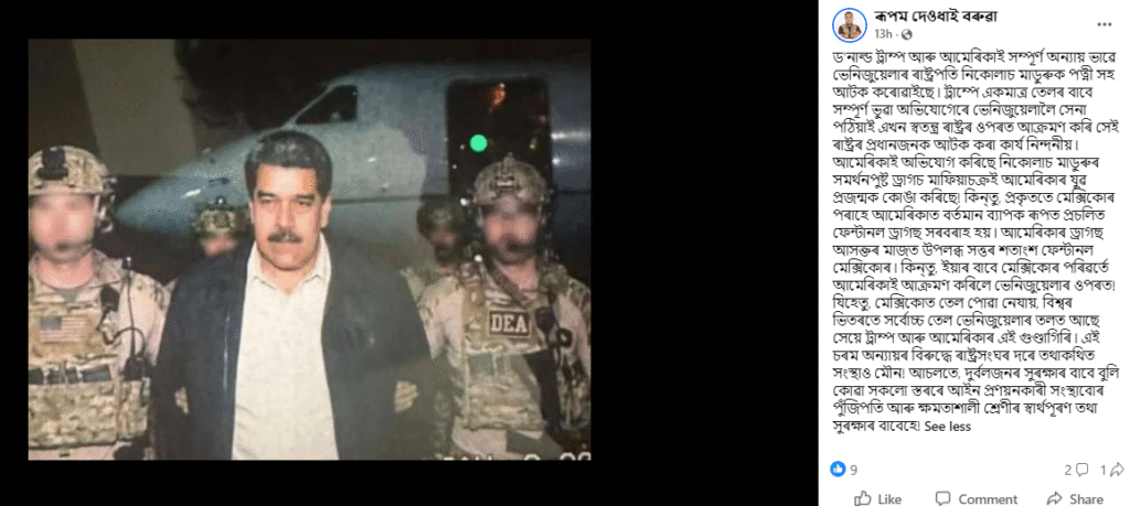 শেহতীয়াকৈ অসমৰ একাংশ ফেচবুক ব্যৱহাৰকাৰীয়ে এখন বিশেষ ফটো আপলোড কৰি দাবী কৰিছে যে সেই ফটোখন ভেনিজুৱেলাৰ ৰাষ্ট্ৰপতি নিকোলাছ মাডুৰোক আমেৰিকাৰ সামৰিক বাহিনীয়ে বন্দী কৰাৰ পাছৰ মুহুৰ্তৰ ফটো।