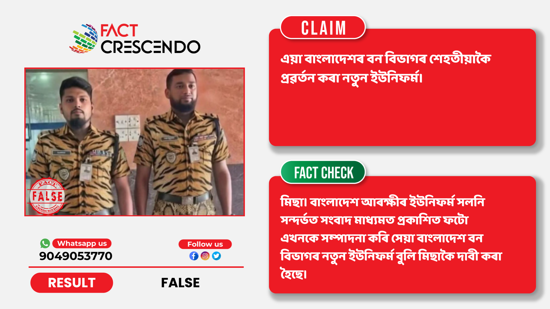 ইয়াৰ পৰাই প্ৰমাণ হয় যে বাংলাদেশ আৰক্ষীৰ ইউনিফৰ্ম সলনি সন্দৰ্ভত সংবাদ মাধ্যমত প্ৰকাশিত ফটো এখনকে সম্পাদনা কৰি সেয়া বাংলাদেশ বন বিভাগৰ নতুন ইউনিফৰ্ম বুলি মিছাকৈ দাবী কৰা হৈছে।