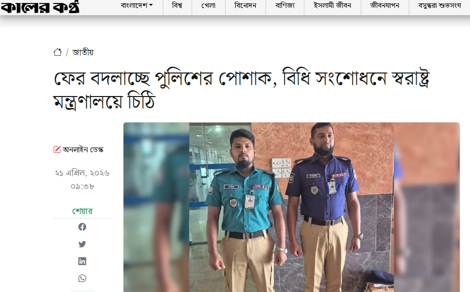 বাংলাদেশৰ আন এক আগশাৰীৰ সংবাদ প্ৰতিষ্ঠান কালেৰ কণ্ঠৰ ফের বদলাচ্ছে পুলিশের পোশাক, বিধি সংশোধনে স্বরাষ্ট্র মন্ত্রণালয়ে চিঠি শীৰ্ষক বাতৰিটোতো একেই কথা উল্লেখ কৰি সেই নিৰ্দিষ্ট ফটোখন ব্যৱহাৰ কৰা হৈছে।