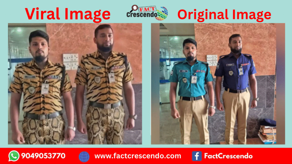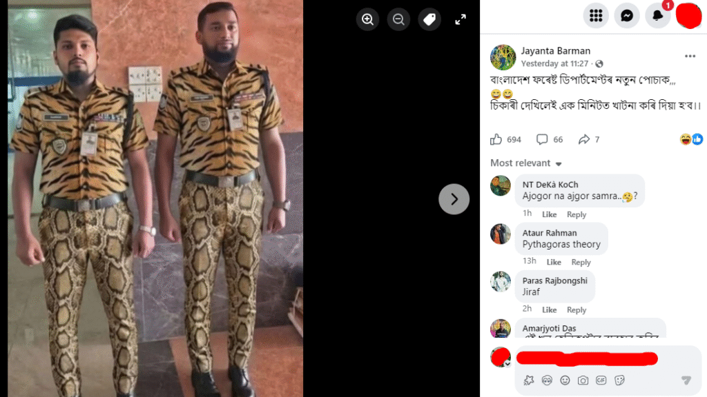 শেহতীয়াকৈ অসমৰ এটা ফেচবুক একাউণ্টত ২৬ এপ্ৰিল ২০২৬ত এখন ফটো আপলোড কৰি সেয়া বাংলাদেশৰ বন বিভাগৰ নতুন পোচাক বুলি দাবী কৰিছে। ফটোখনত দুগৰাকী ব্যক্তিয়ে জন্তুৰ চালৰ পোচাক পিন্ধি থকা দেখা গৈছে। লিখিছে- বাংলাদেশ ফৰেষ্ট ডিপাৰ্টমেণ্টৰ নতুন পোচাক,,,চিকাৰী দেখিলেই এক মিনিটত খাটনা কৰি দিয়া হ’ব।।