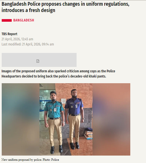 আনকি দ্য বিজনেছ ষ্টেণ্ডাৰ্ডৰ Bangladesh Police proposes changes in uniform regulations, introduces a fresh design বাতৰিতো আমি একেই তথ্য আৰু আলোকচিত্ৰ পালোঁ।