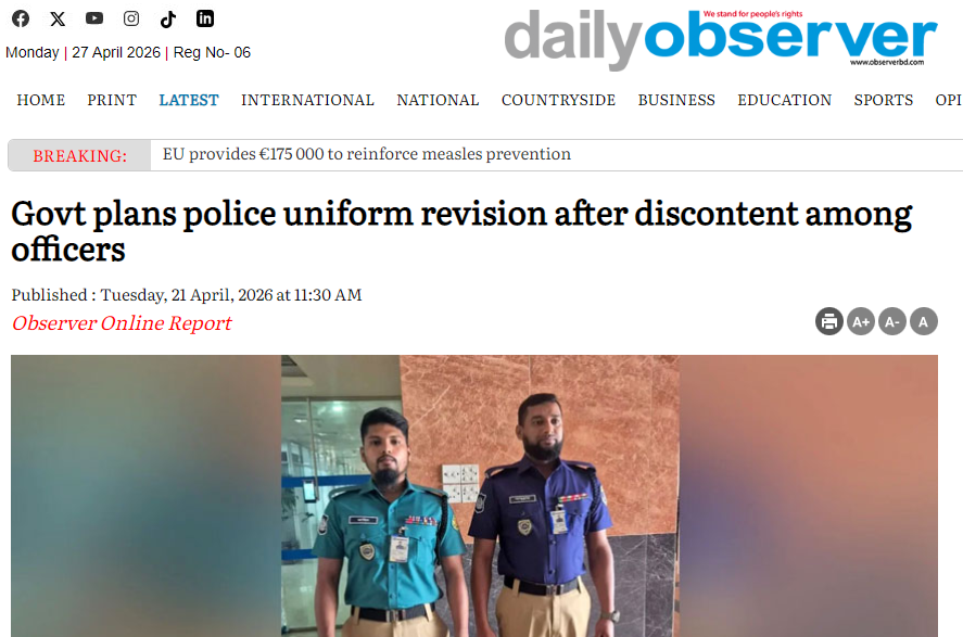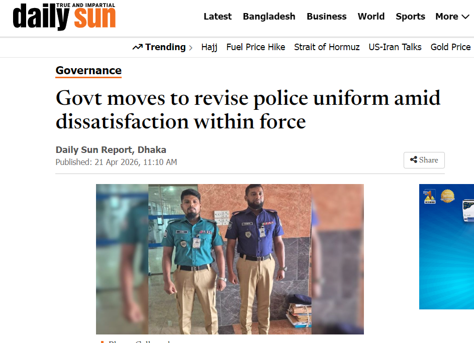 বাংলাদেশৰ অগ্ৰনী সংবাদ প্ৰতিষ্ঠান ডেইলী চানৰ Govt moves to revise police uniform amid dissatisfaction within force শীৰ্ষক বাতৰিত কোৱা হৈছে যে আৰক্ষীৰ বাহিনীৰ আভ্যন্তৰীণ অসন্তুষ্টিৰ খবৰ আৰু শীৰ্ষ বিষয়াসকলে উত্থাপন কৰা উদ্বেগৰ পাছতে চৰকাৰে শেহতীয়াকৈ প্ৰৱৰ্তন কৰা আৰক্ষীৰ ইউনিফৰ্ম সংশোধন কৰাৰ সিদ্ধান্ত গ্ৰহণ কৰিছে। গৃহ পৰিক্ৰমা মন্ত্ৰালয়লৈ প্ৰেৰণ কৰা এক প্ৰস্তাৱত আৰক্ষী মুখ্য কাৰ্যালয়ে আৰক্ষীৰ সাজ-পোছাক নিয়ম-২০২৫ সংশোধনৰ পৰামৰ্শ দিছে, য’ত কৰ্মী আৰু জনমতৰ মাজত সৃষ্টি হোৱা “নেতিবাচক আৱেগ”ৰ প্ৰতি লক্ষ্য ৰাখি বিভিন্ন ইউনিটৰ বাবে নতুন ৰঙৰ পোচাকৰ পৰামৰ্শ দিয়া হৈছে। আৰক্ষী মুখ্য কাৰ্যালয়ৰ লজিষ্টিক শাখাই প্ৰেৰণ কৰা প্ৰস্তাৱ অনুসৰি মহানগৰ আৰক্ষী বিষয়াসকলে পাতল জলফাই ৰঙৰ চাৰ্ট পিন্ধিব, আনহাতে জিলা আৰু অন্যান্য আৰক্ষী ইউনিটসমূহে গভীৰ নীলা ৰঙৰ চাৰ্ট পিন্ধিব। সকলো কৰ্মীৰ বাবে ট্ৰাউজাৰ খাকী ৰঙৰে হৈ থাকিব।