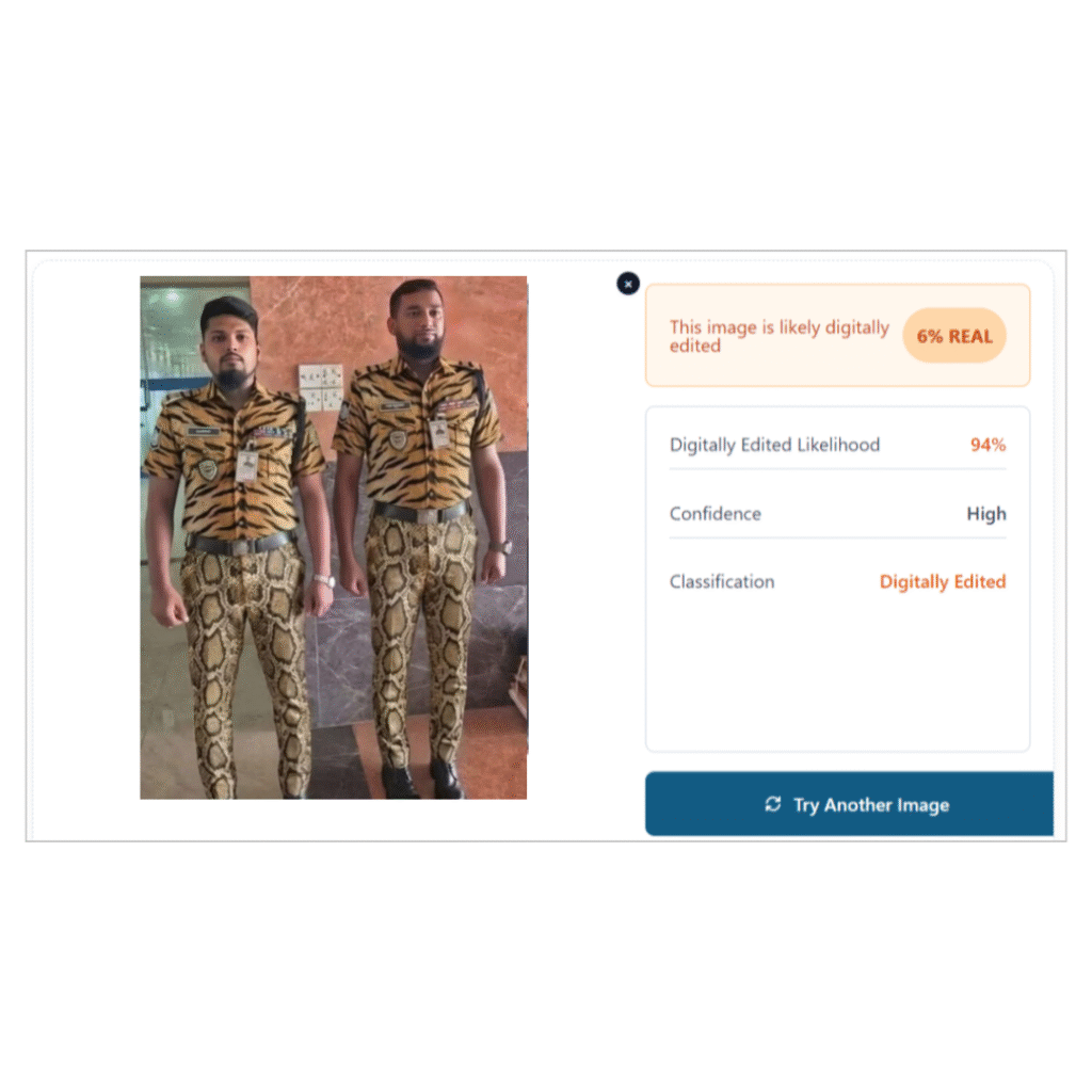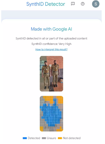 সেই মূল ফটোখন লাভ কৰাৰ পাছত আমি ভাইৰেল ফটোখন সম্পাদিত ফটো হ’ব পাৰে বুলি সন্দেহ কৰি আমি সেইফটোখন পৰীক্ষা কৰিলোঁ। তেতিয়া আমি ব্যক্তি দুজনৰ পোচাকত বিসংগতি দেখিলোঁ। সেয়া কৃত্ৰিম বুদ্ধিমত্তাৰে সৃষ্টি কৰা হৈছেনে নাই তাৰ পৰীক্ষা কৰাৰ বাবে একাধিক AI content detector toolsত ফটোখন পৰীক্ষা কৰিলোঁ। SynthID Detectorএ এয়া AI Generated বুলি প্ৰকাশ কৰিছে।