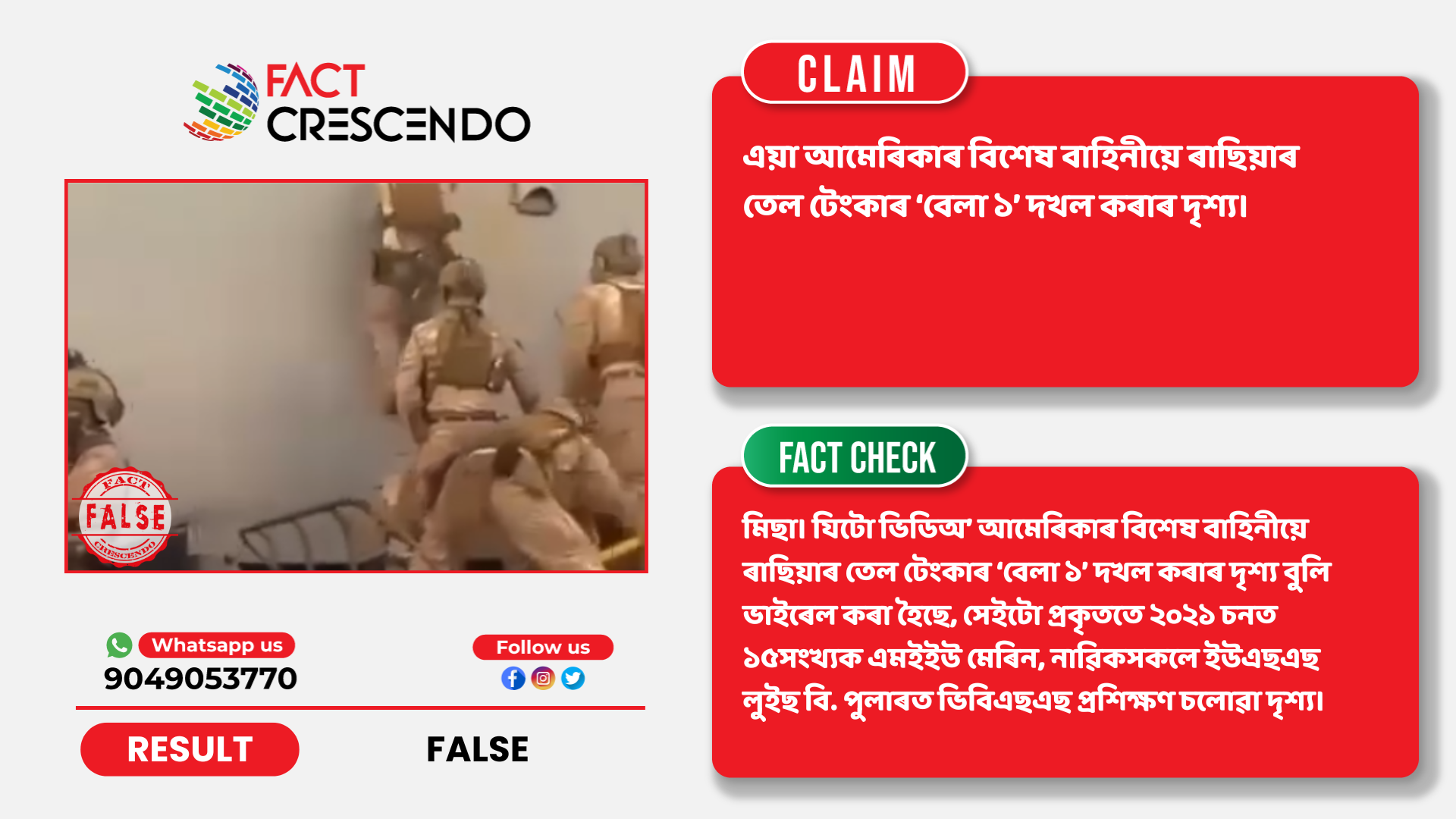 শেহতীয়াকৈ অসমৰ এগৰাকী ফেচবুক ব্যৱহাৰকাৰীয়ে এটা ভিডিঅ’ আপলোড কৰি দাবী কৰিছে যে সেয়া আমেৰিকাৰ বিশেষ বাহিনীয়ে ৰাছিয়াৰ তেল টেংকাৰ ‘বেলা ১’ দখল কৰাৰ দৃশ্য।