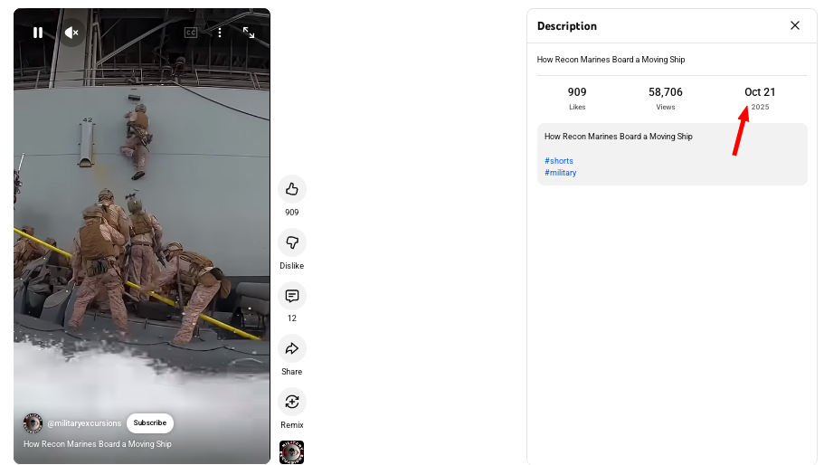 অনুসন্ধানৰ আৰম্ভণীতে আমি ভিডিঅ’টো এক বিশেষ কাৰিকৰী ব্যৱস্থাৰে কী-ফ্ৰেমত ভাগ কৰি লৈ ৰিভাৰ্ছ ইমেড ছাৰ্চ কৰিলোঁ আৰু তাৰ ফলত আমি ২০২৫ৰ অক্টোবৰত ইউটিউৱত “How Recon Marines Board a Moving Ship.” নামেৰে আপলোড কৰা এটা দীঘলীয়া ভিডিঅ’ পালোঁ। আমি দেখিলোঁ যে সেই ভিডিঅ’টোৱেই আমি সত্যতা নিৰূপণ কৰি থকা ভিডিঅ’ ক্লিপটোৰ মূল ভিডিঅ’। ইউটিউৱত পোৱা সেই ভিডিঅ’টো পৰীক্ষা কৰি জানিব পাৰিলোঁ যে ভাইৰেল ভিডিঅ’টো মূল ভিডিঅ’টোৰ এটা সৰু টুকুৰাহে,যিটো ওলোটাই লোৱা হৈছে আৰু সম্পাদনা কৰি ৰংটো ঈষত হালধীয়া কৰা হৈছে।