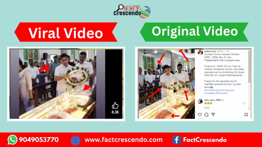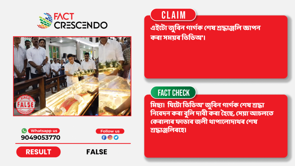 ফেক্ট ক্ৰেছেণ্ডো অসমীয়াৰ অনুসন্ধানত এই কথা নিশ্চিত হৈছে দাবীটো মিছা। যিটো ভিডিঅ’ জুবিন গাৰ্গক শেষ শ্ৰদ্ধা নিবেদন কৰা বুলি দাবী কৰা হৈছে, সেয়া আচলতে কেৰালাৰ ফাডাৰ জলী থাপালোদাথৰ শেষ শ্ৰদ্ধাঞ্জলিৰহে।