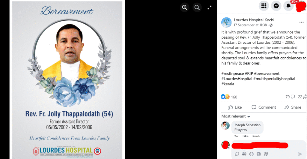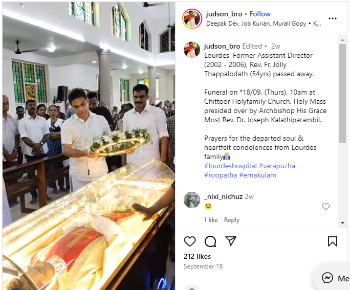 আনহাতে ইনষ্টাগ্ৰামত ১৮ চেপ্তেম্বৰ ২০২৫ত(জুবিন গাৰ্গৰ দেহাৱসানৰ এদিন পূৰ্বে) এটা ভিডিঅ’ আপলোড কৰা হৈছে। তাত ভাইৰেল হোৱা এই ভিডিঅ’ও আছে। তাতো উল্লেখ কৰা হৈছে যে এয়া ফাডাৰ জলী থাপালোদথৰ নশ্বৰদেহ। ইংৰাজীত লিখিছে- Lourdes’ Former Assistant Director (2002 – 2006), Rev. Fr. Jolly Thappalodath (54yrs) passed away. Funeral on *18/09, (Thurs), 10am at Chittoor Holyfamily Church, Holy Mass presided over by Archbishop His Grace Most Rev. Dr. Joseph Kalathiparambil. Prayers for the departed soul & heartfelt condolences from Lourdes family (লৌৰ্ডেছৰ প্ৰাক্তন সহকাৰী সঞ্চালক (২০০২ – ২০০৬), ৰেভাৰেণ্ড ফাডীৰ জলী থাপালোদথ (৫৪বছৰ)ৰ মৃত্যু হয়। *১৮/০৯, (বৃহস্পতিবাৰ), পুৱা ১০ বজাত চিত্তুৰ হলিফেমিলি চাৰ্চত, আৰ্কবিশ্বপ হিজ গ্ৰেচ মষ্ট ৰেভাৰেণ্ড ড° জোচেফ কালাথিপাৰাম্বিলৰ সভাপতিত্বত পবিত্ৰ মিচত শেষকৃত্য সম্পন্ন কৰা হ’ব। বিদায়ী আত্মাৰ বাবে প্ৰাৰ্থনা & লৌৰ্ডছ পৰিয়ালৰ পৰা আন্তৰিক সমবেদনা)