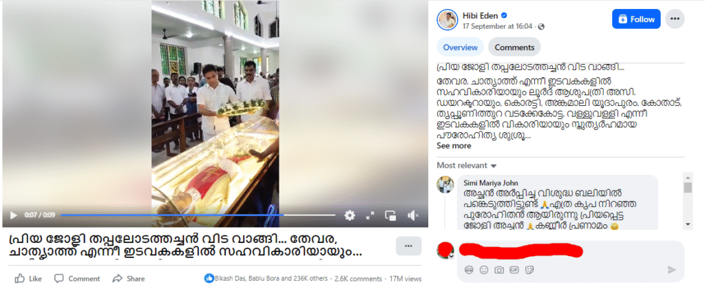 অনুসন্ধানৰ আৰম্ভণীতে আমি ভিডিঅ’টোৰ কী-ফ্ৰেমৰ ৰিভাৰ্ছ ইমেজ ছাৰ্চ কৰি চালোঁ। তেতিয়া প্ৰথমে আমি যোৱা ১৭ চেপ্তেম্বৰ ২০২৫ত(জুবিন গাৰ্গৰ দেহাৱসানৰ দুদিন পূৰ্বেই) ফেচবুকত এই ভিডিঅ’টো আপলোড কৰি মালায়ালাম ভাষাত কেপছন লিখা দেখা পালোঁ। কেপছনটোৰ অসমীয়া অনুবাদ হৈছে- প্ৰিয় জলী থাপালোদথে বিদায় লয়…থেভাৰা আৰু চাথ্যাথৰ প্যাৰিছত সহযোগী ভাইকাৰ হিচাপে, লৌৰ্ডেছ হাস্পতালৰ সহকাৰী পৰিচালক হিচাপে আৰু কোৰাট্টি, অংগমালি যুডাপুৰম, কোথাড, ত্ৰিপুনিথুৰা ভাডাক্কেকোট্টামা আৰু ভালুভাল্লীৰ প্যাৰিছত ভাইকাৰ হিচাপে তেওঁ পুৰোহিত হিচাপে প্ৰশংসনীয় সেৱা আগবঢ়ায়। তাৰ অৰ্থ হৈছে এয়া কেৰালাৰ এগৰাকী ধৰ্মীয় ব্যক্তিৰ নশ্বৰদেহ।