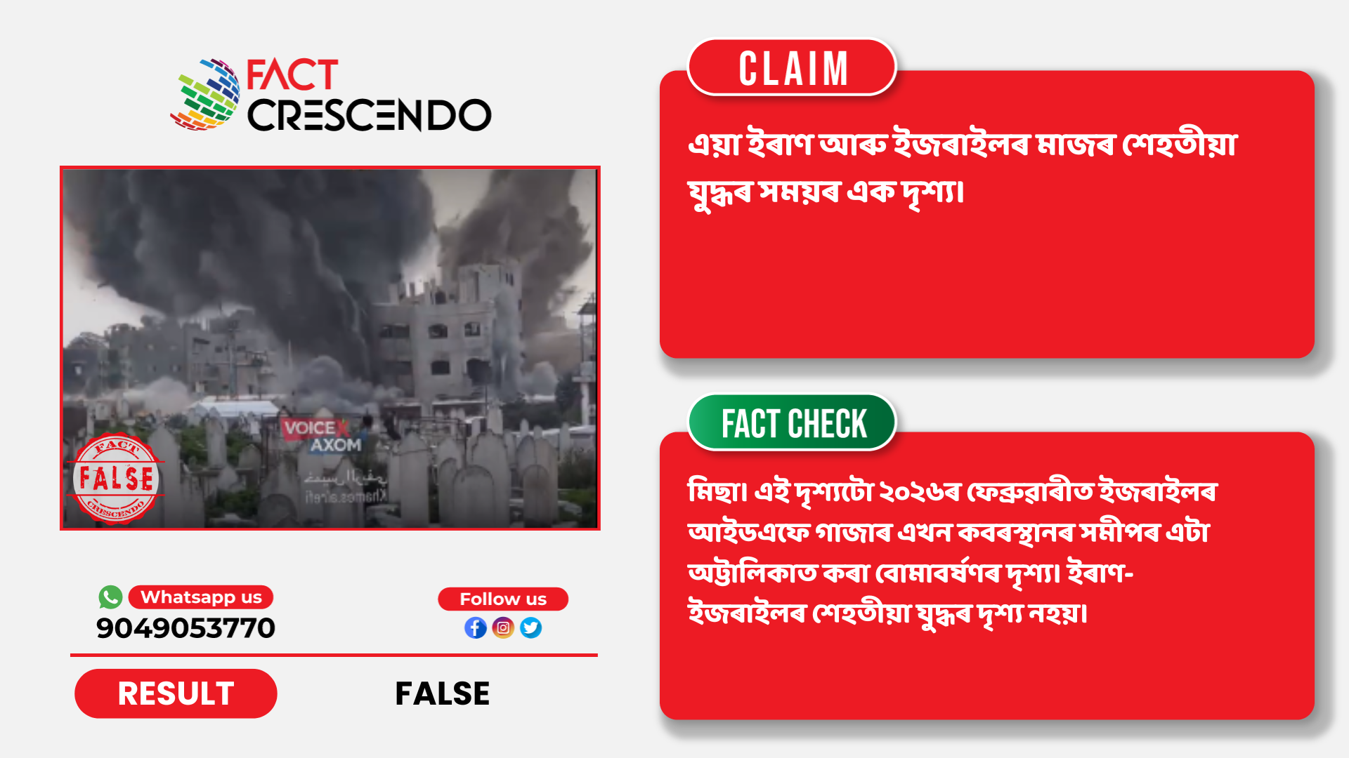 ইয়াৰ পৰা স্পষ্ট হৈ পৰে যে এই দৃশ্যটো ২০২৬ৰ ফেব্ৰুৱাৰীত ইজৰাইলৰ আইডএফে গাজাৰ এখন কবৰস্থানৰ সমীপৰ এটা অট্টালিকাত কৰা বোমাবৰ্ষণৰ দৃশ্য। ইৰাণ-ইজৰাইলৰ শেহতীয়া যুদ্ধৰ দৃশ্য নহয়। দাবীটো মিছা।