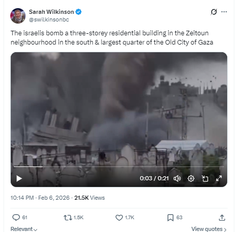 অনুসন্ধানৰ আৰম্ভণিতে আমি সেই ভিডিঅ’টোৰ কী-ফ্ৰেমৰ ৰিভাৰ্ছ ইমেজ ছাৰ্চ কৰিলোঁ। তেতিয়া আমি ৬ ফেব্ৰুৱাৰী ২০২৬ত এই ভিডিঅ’টো এক্সত পেলেষ্টাইনৰ স্বাধীনতাৰ বাবে কাম কৰি থকা Sarah Wilkinson নামৰ এগৰাকী ব্যক্তিয়ে টুইট কৰিছিল। তাত লিখা আছে – The israelis bomb a three-storey residential building in the Zeitoun neighbourhood in the south & largest quarter of the Old City of Gaza (পুৰণি গাজাৰ দক্ষিণ অঞ্চলৰ সমীপৰ জেইটাউনত থকা এটা তিনিমহলীয়া আৱাসিক অট্টালিকাত ইজৰাইলীয়ে বোমাবৰ্ষণ কৰে।)