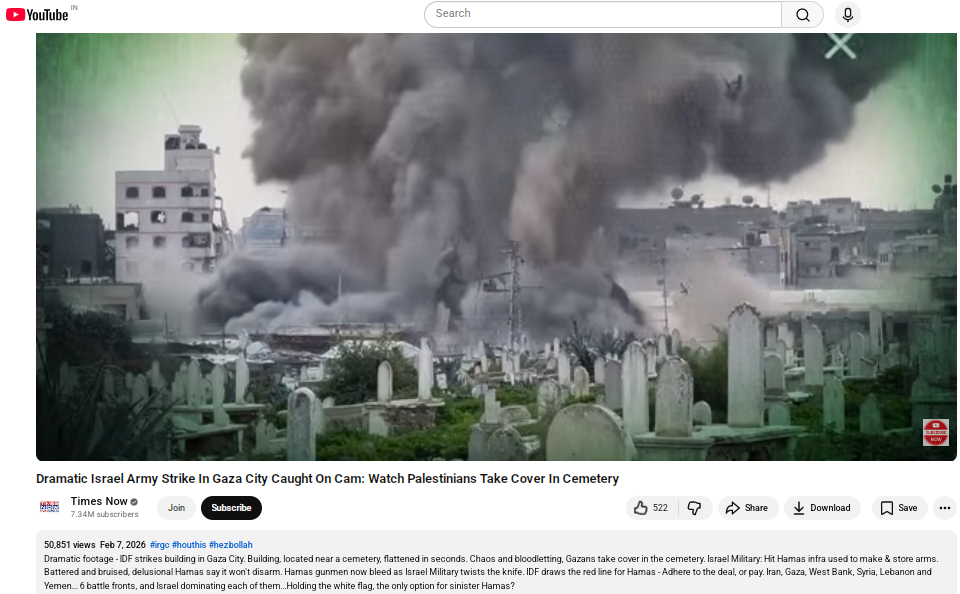 তদুপৰি ২০২৬ৰ ৭ ফেব্ৰুৱাৰীত টাইমছ নাওৰ ইউটিউৱ চেনেলত Dramatic Israel Army Strike In Gaza City Caught On Cam: Watch Palestinians Take Cover In Cemetery শীৰ্ষক বাতৰিটোত আমি এই ভিডিঅ’টো দেখিলোঁ। তাত বৰ্ণনাত লিখা আছিল- Dramatic footage – IDF strikes building in Gaza City. Building, located near a cemetery, flattened in seconds. Chaos and bloodletting, Gazans take cover in the cemetery. Israel Military: Hit Hamas infra used to make & store arms. Battered and bruised, delusional Hamas say it won’t disarm. Hamas gunmen now bleed as Israel Military twists the knife. IDF draws the red line for Hamas – Adhere to the deal, or pay. Iran, Gaza, West Bank, Syria, Lebanon and Yemen… 6 battle fronts, and Israel dominating each of them…Holding the white flag, the only option for sinister Hamas? (নাটকীয় ফুটেজ – গাজা চহৰত অট্টালিকাত আক্ৰমণ আইডিএফ। কবৰস্থানৰ ওচৰত অৱস্থিত অট্টালিকাটো কেইছেকেণ্ডমানৰ ভিতৰতে সমতল হৈ পৰিল। বিশৃংখলতা আৰু ৰক্তপাতত গাজাবাসীয়ে কবৰস্থানত আশ্ৰয় লয়। ইজৰাইল মিলিটাৰী: হিট হামাছ ইনফ্ৰাই অস্ত্ৰ নিৰ্মাণ আৰু সংৰক্ষণ কৰিবলৈ লৈছিল। মাৰপিট আৰু আঘাতত অভ্যস্ত হামাছে কয় যে তেওঁলোক নিৰস্ত্ৰ নহয়। ইজৰাইল মিলিটাৰীয়ে চুৰি চলোৱাৰ লগে লগে এতিয়া হামাছৰ বন্দুকধাৰীবোৰ ৰক্তাক্ত হৈছে। আইডিএফে হামাছৰ বাবে ৰক্ত-ৰেখা অংকন কৰিছে – হয়তো চুক্তি মানিব অথবা ধন দিব। ইৰাণ, গাজা, পশ্চিমাঞ্চল, ছিৰিয়া, লেবানন আৰু য়েমেন…৬ যুদ্ধ ক্ষেত্ৰ আৰু ইজৰাইলে সকলোতে আধিপত্য বিস্তাৰ কৰিছে…শুভ্ৰ পতাকা উৰুওৱাটোৱেই অশুভ হামাছৰ বাবে একমাত্ৰ বিকল্প?)