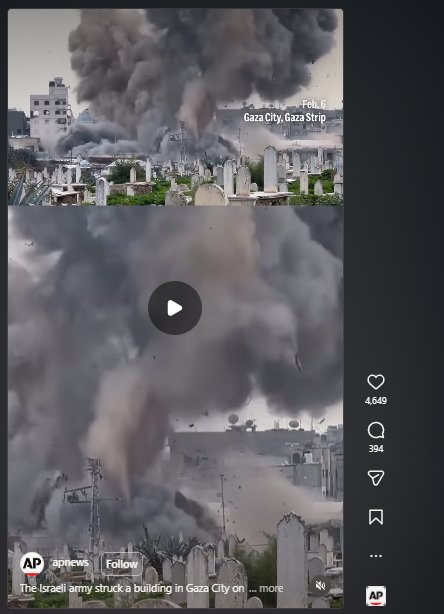 আনফালে এছোচিয়েটেড প্ৰেছৰ ইনষ্টাগ্ৰামতো আমি এই দৃশ্যটো পালোঁ। ৬ ফেব্ৰুৱাৰী ২০২৬ত আপলোড কৰা এই বাতৰিটোত লিখা হৈছিল- The Israeli army struck a building in Gaza City on Friday after issuing a warning. The building, near a cemetery in Zeitoun, was flattened on video. No casualties were reported as it had been evacuated. (শুকুৰবাৰে গাজা চহৰৰ এটা অট্টালিকাত সতৰ্কবাণী জাৰি কৰি ইজৰাইল সেনাই আঘাত হানে। জেইটাউনৰ এখন কবৰস্থানৰ সমীপত থকা এই অট্টালিকাটো সমতল কৰি তোলা হৈছে। ইয়াক খালী কৰা হৈছে বাবে কোনো লোকৰ মৃত্যুৰ খবৰ পোৱা নগ’ল।)