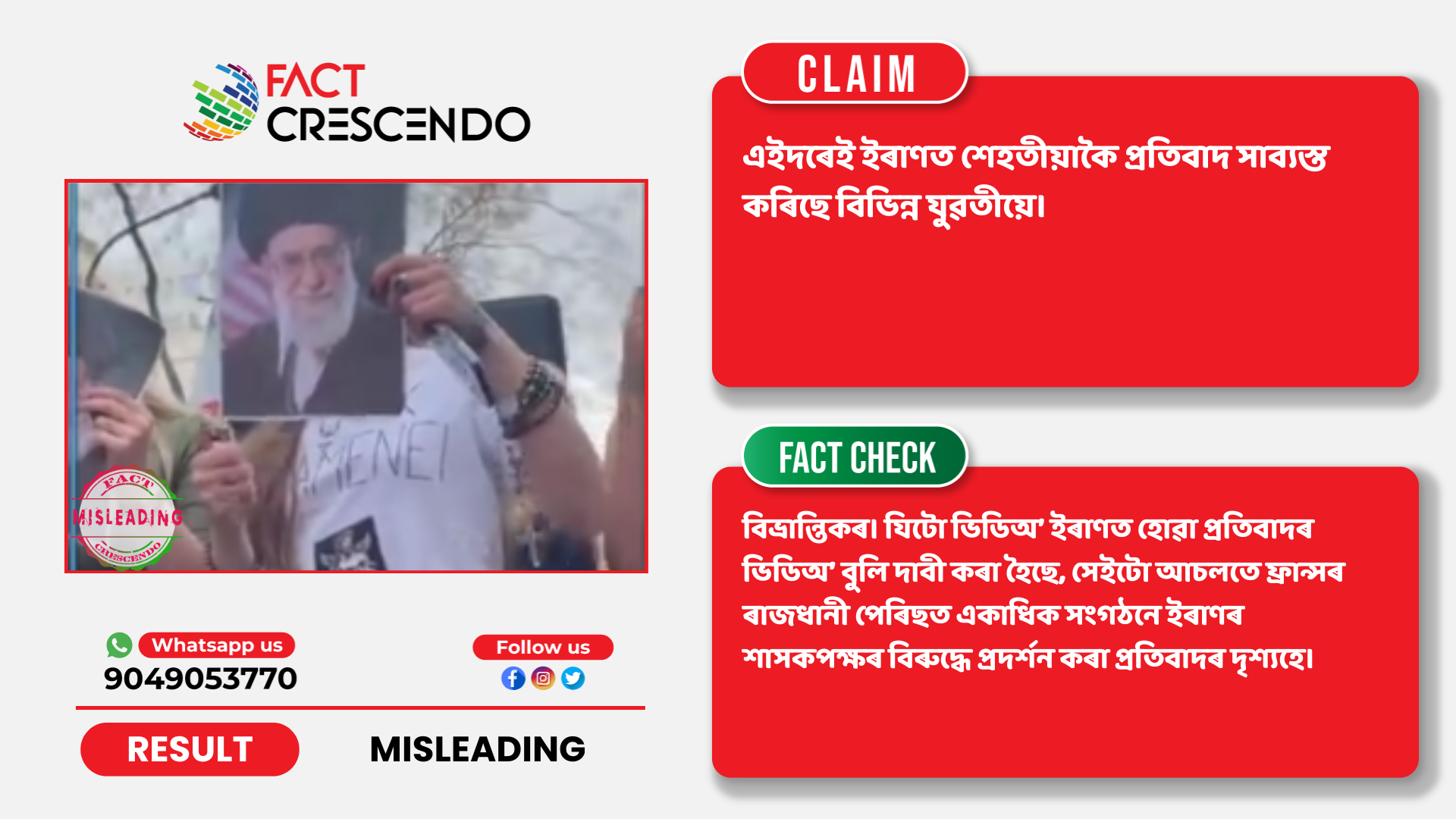 ফেক্ট ক্ৰেছেণ্ডো অসমীয়াৰ অনুসন্ধানত এই কথা নিশ্চিত হৈছে যে দাবীটো বিভ্ৰান্তিকৰ। যিটো ভিডিঅ’ ইৰাণত হোৱা শেহতীয়া প্ৰতিবাদৰ ভিডিঅ’ বুলি দাবী কৰা হৈছে, সেইটো আচলতে ফ্ৰান্সৰ ৰাজধানী পেৰিছত একাধিক সংগঠনে ইৰাণৰ শাসকপক্ষৰ বিৰুদ্ধে প্ৰদৰ্শন কৰা প্ৰতিবাদৰ দৃশ্যহে।