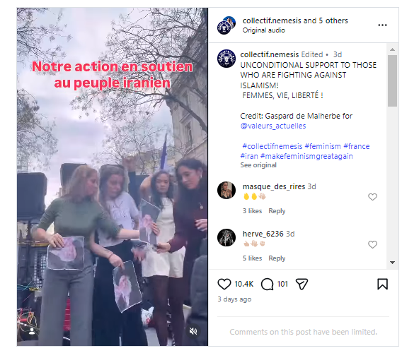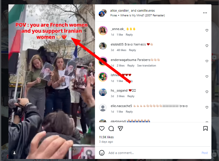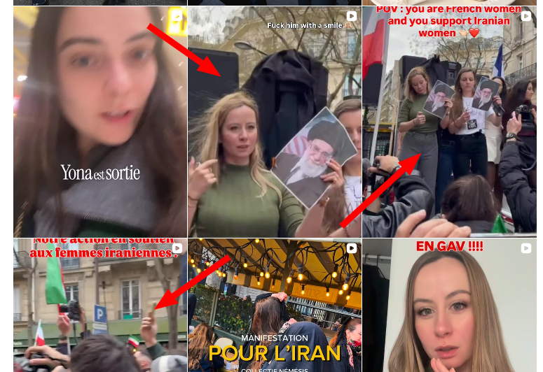তাৰে এটা ভিডিঅ’ত আমি দেখিলোঁ যে তাত টেক্সট ওভালে’ কৰি লিখা আছে- You are French women and you support Iranian women।