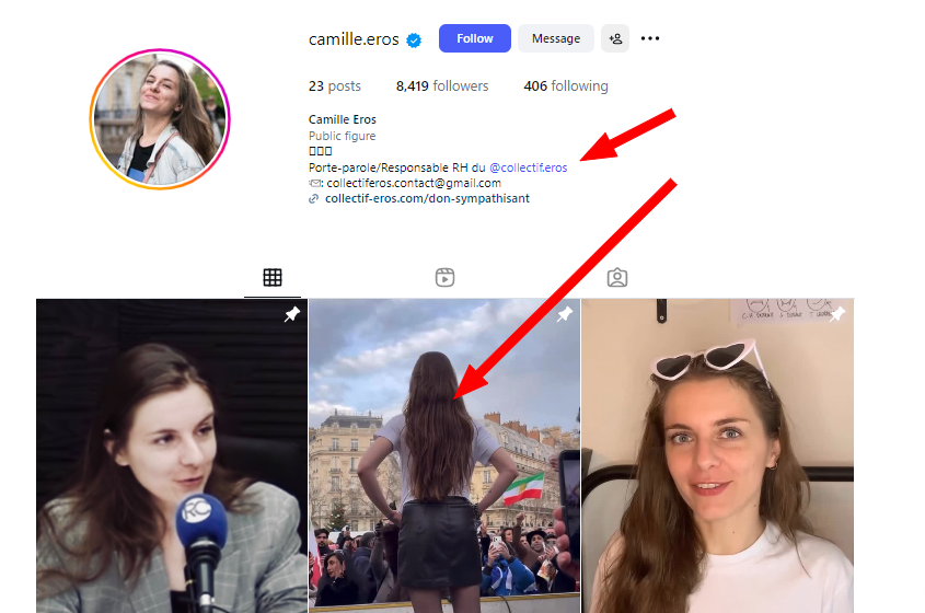 আমি সেই হেণ্ডেলটো পৰীক্ষা কৰি চাই দেখিলোঁ যে সেইটো কেমিল ইৰছ নামৰ ফ্ৰান্সৰ এগৰাকী সমাজকৰ্মীৰ হেণ্ডেল। তেওঁ কালেক্টিভ ইৰছ নামৰ সংস্থাটোৰ সৈতে জৰিত। তেওঁলোকে শেহতীয়াকৈ ফ্ৰান্সৰ পেৰিছত ইৰাণৰ শেহতীয়া পৰিস্থিতিৰ বিৰুদ্ধে যোৱা ১১ জানুৱাৰী ২০২৬ত এইদৰে প্ৰতিবাদী কাৰ্যসূচী ৰূপায়ণ কৰিছিল। সেই প্ৰতিবাদীকাৰ্যসূচীত তেওঁলোকে হিজাব খুলি আৰু খামেইনীৰ ফটো জ্বলাই বিক্ষোভ প্ৰদৰ্শন কৰিছিল। তাত দেখা বগা বৰণৰ চোলা পৰিহিতা যুৱতীগৰাকীয়েই হৈছে কেমিল ইৰছ।