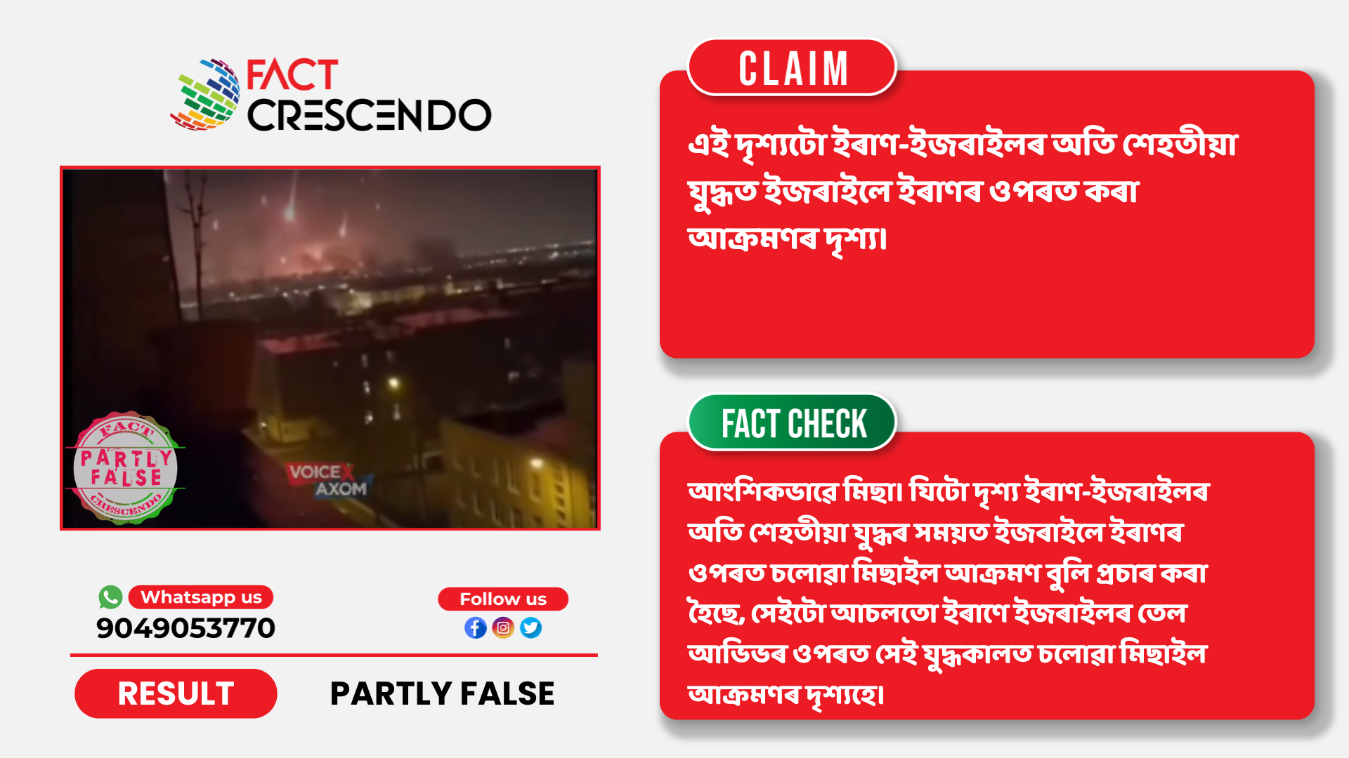 ইয়াৰ পৰা নিশ্চিত হয় যে যিটো দৃশ্য ইৰাণ-ইজৰাইলৰ অতি শেহতীয়া যুদ্ধৰ সময়ত ইজৰাইলে ইৰাণৰ ওপৰত চলোৱা মিছাইল আক্ৰমণ বুলি প্ৰচাৰ কৰা হৈছে, সেইটো আচলতো ইৰাণে ইজৰাইলৰ তেল আভিভৰ ওপৰত সেই যুদ্ধকালত চলোৱা মিছাইল আক্ৰমণৰ দৃশ্যহে। দাবীটো আংশিকভাৱে মিছা।