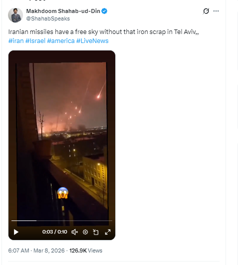 তদুপৰি এক্সতো ৮ মাৰ্চ ২০২৬ত এই ভিডিঅ’টো টুইট কৰি আপলোড কৰিছে আৰু লিখিছে- Iranian missiles have a free sky without that iron scrap in Tel Aviv,,