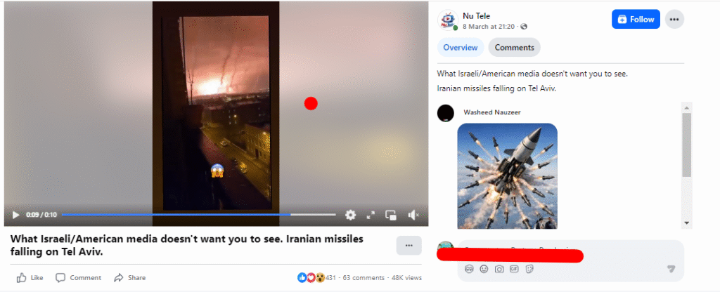 ৭ মাৰ্চ ২০২৬ত আন এটা ফেচবুক পোষ্টত এই ভিডিঅ’টো আপলোড কৰা হৈছিল। তাত লিখা হৈছিল- Urgent 7-3-2026. Iranian missiles soar freely over Tel Aviv, unhindered by the Iron Dome. ইয়াতো সেয়া তেল আভিভৰ ওপৰত ইৰাণৰ আক্ৰমণ বুলি কোৱা হৈছে।