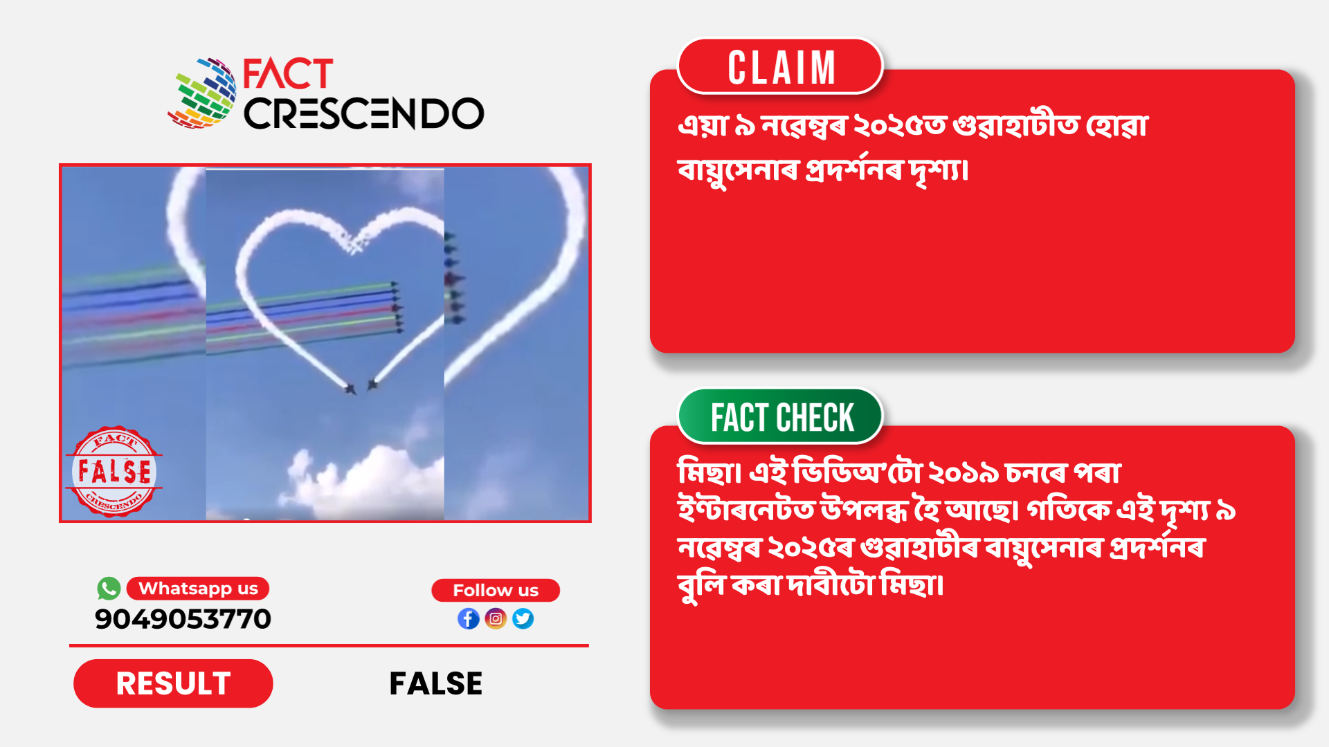 ফেক্ট ক্ৰেছেণ্ডো অসমীয়াৰ অনুসন্ধানত এই কথা নিশ্চিত হৈছে যে দাবীটো মিছা। এই ভিডিঅ’টো ২০১৯ চনৰে পৰা ইণ্টাৰনেটত উপলব্ধ হৈ আছে। গতিকে এই দৃশ্য ৯ নৱেম্বৰ ২০২৫ৰ গুৱাহাটীৰ বায়ুসেনাৰ প্ৰদৰ্শনৰ বুলি কৰা দাবীটো মিছা।