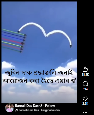৯ নৱেম্বৰ ২০২৫ দেওবাৰে গুৱাহাটীৰ লাচিত ঘাটত ভাৰতীয় বায়ুসেনাই এক বিশেষ বিমান উৰণ প্ৰদৰ্শন কাৰ্যসূচী ৰূপায়ন কৰে। তাৰে পৰিপ্ৰেক্ষিতত অসমৰ সামাজিক মাধ্যমত কিছুমান দৃশ্য ভাইৰেল হৈ পৰিছে। অসমৰ এগৰাকী ফেচবুক ব্যৱহাৰকাৰীয়ে এটা বিশেষ ভিডিঅ’ আপলোড কৰি দাবী কৰিছে যে সেয়া ৯ নৱেম্বৰৰ প্ৰদৰ্শনৰ দৃশ্য আৰু সেয়া সদ্য প্ৰয়াত জুবিন গাৰ্গলৈ বুলি এক শ্ৰদ্ধাঞ্জলি।