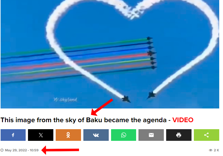 ২০২২ৰ ২৯মে’ত আজাৰবাইজানৰ এক সংবাদ প্ৰতিষ্ঠানে প্ৰকাশ কৰা এক বাতৰিত এই ভিডিঅ’টো ব্যৱহাৰ কৰি সেয়া বাকুৰ এক বিমান প্ৰদৰ্শন বুলি উল্লেখ কৰিছে।