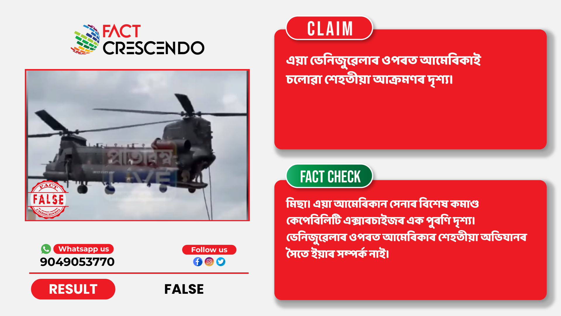 ফেক্ট ক্ৰেছেণ্ডো অসমীয়াৰ অনুসন্ধানত এই কথা নিশ্চিত হৈছে যে দাবীটো মিছা। এয়া আমেৰিকান সেনাৰ বিশেষ কমাণ্ড কেপেবিলিটি এক্সাৰচাইজৰ এক পুৰণি দৃশ্য। ভেনিজুৱেলাৰ ওপৰত আমেৰিকাৰ শেহতীয়া অভিযানৰ সৈতে ইয়াৰ সম্পৰ্ক নাই।